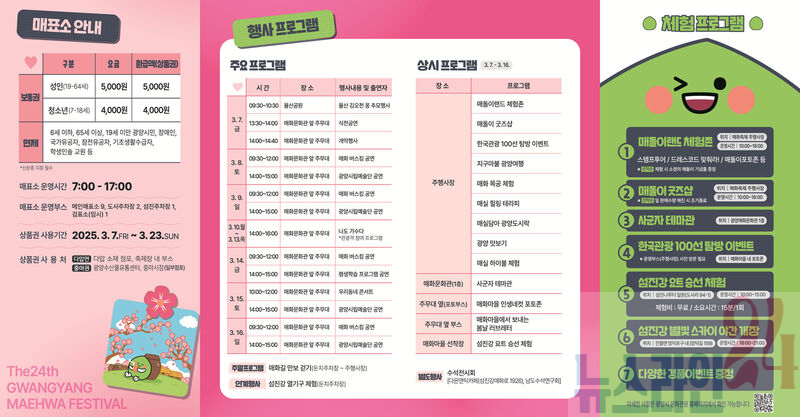 제24회 광양매화축제, 꽃만 보고 가면 후회…킬러 콘텐츠 풍성 한국관광 100선 탐방 이벤트, 매돌이랜드체험존, 매돌이굿즈샵, 지구마불 광양여행 섬진강 열기구 체험, 섬진강 요트 승선 체험, 섬진강 별빛 스카이 야간 개장