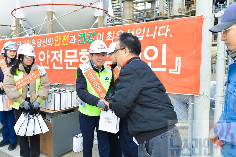 정기명 여수시장이 27일 오전 7시 한화솔루션㈜여수공장 대정비 사업장에서 ‘여수산단 출근길 안전문화 캠페인’을 펼쳤다.