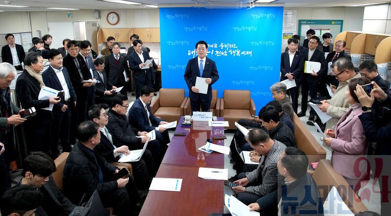 김영록 전남지사가 4일 도청 기자실에서 미국 순방 성과 기자 간담회를 열고 "총 15조 원 규모의 투자 유치해 세계 최대 규모인 3GW 이상의 솔라시도 AI 슈퍼클러스터 허브' 조성 프로젝트를 위한 첫발을 내딛는 성과를 거뒀다"고 밝혔다.