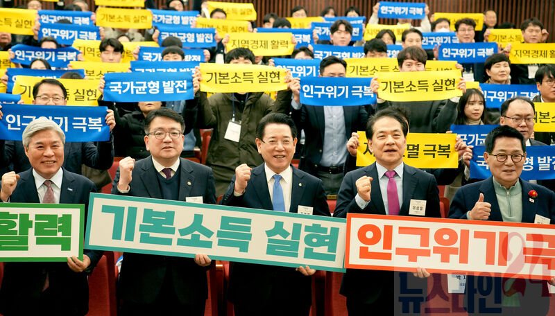 김영록 전라남도지사가 5일 오후 국회도서관에서 열린 ‘에너지 기본소득, 국회포럼’에서 주요 내·외빈 및 참석자들과 재생에너지 전환과 에너지 기본소득 도입 활성화를 위한 퍼포먼스를 하고 있다.