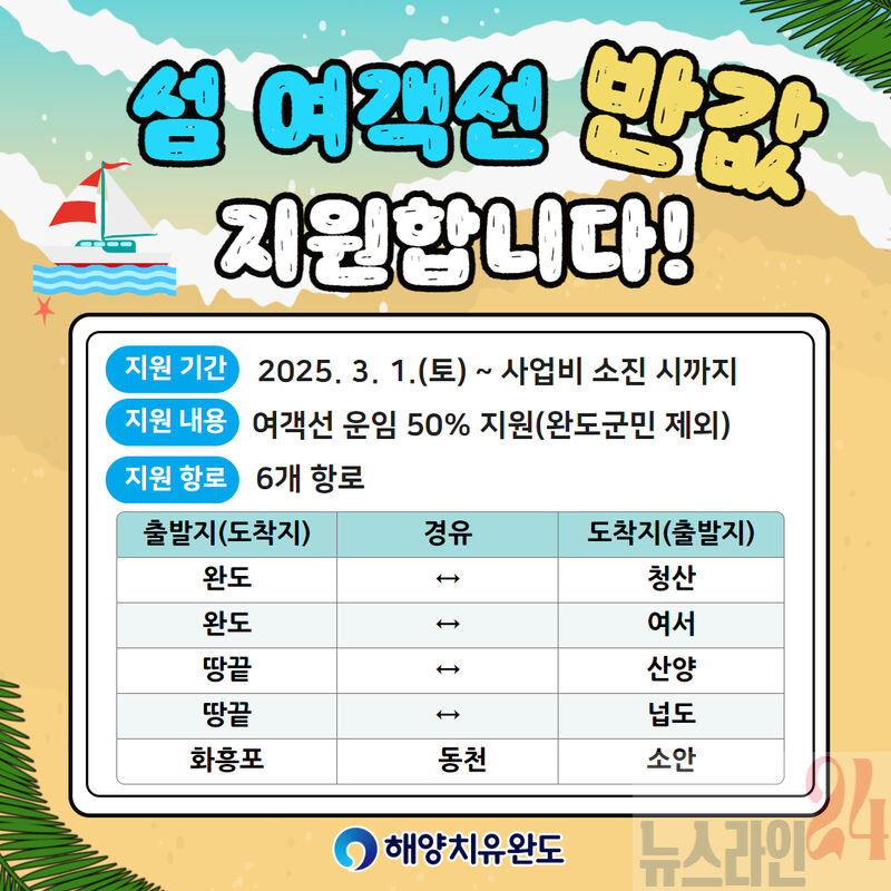완도군(군수 신우철)은 ‘2025 완도 방문의 해’를 맞아 3월 1일부터 관광객 유치와 지역 경제 활성화를 위해 섬 여객선 반값 운임 지원 사업을 추진한다.
