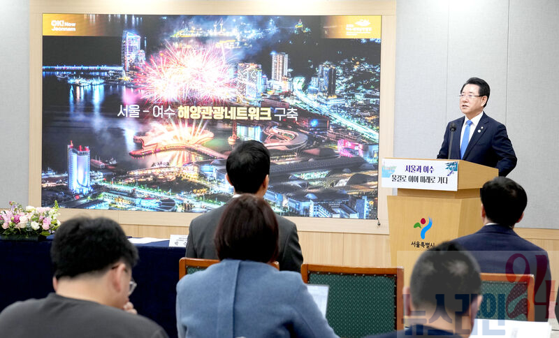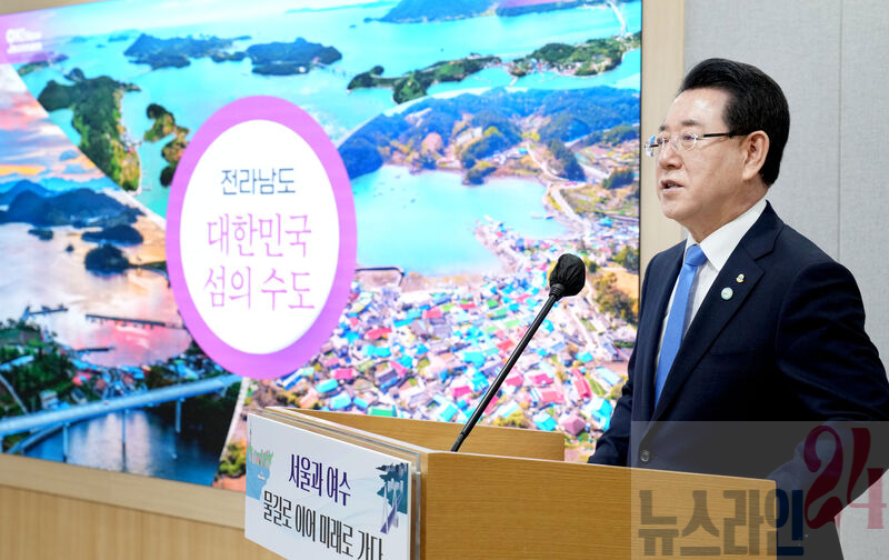 김영록 전라남도지사가 7일 서울시청 브리핑룸에서 열린 ‘2026여수세계섬박람회조직위-서울시 업무협약‘ 행사에서 섬박람회에 관련된 PT를 발표하고 있다.