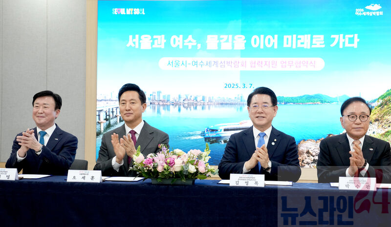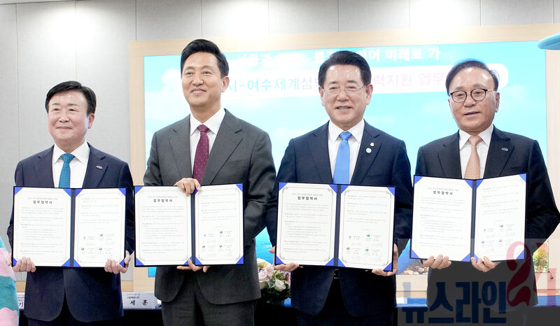 김영록 전라남도지사(오른쪽 두 번째)가 7일 서울시청 브리핑룸에서 오세훈 서울시장, 정기명 여수시장, 박수관 조직위원장과 ‘2026여수세계섬박람회조직위-서울시 업무협약‘을 하고 있다.
