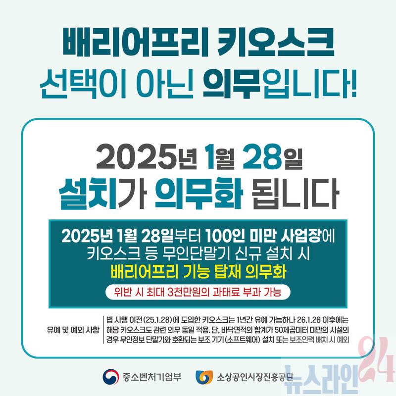 만약 키오스크 등 무인단말기를 도입했거나 신규로 도입할 예정이라면 가장 관심있게 봐야할 사업으로 현재 일반 키오스크가 있는 경우 2025년 1월 28일 이후 1년 이내 배리어프리 키오스크로 교체해야 하며 신규로 키오스크를 구매하려는 경우 반드시 배리어프리 키오스크를 구매해야 한다.