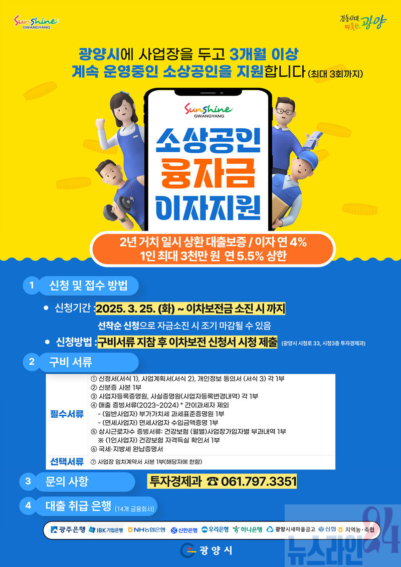 광양시는 경기 침체와 운영난을 겪고 있는 소상공인의 부담을 덜기 위해 오는 3월 25일부터 '2025년 광양시 소상공인 융자금 이차보전 지원사업'을 시행한다고 밝혔다.