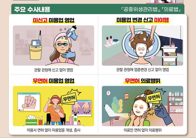 이번 수사의 중점 대상은 ▲미신고 미용업 영업 ▲미용업 변경신고 미이행 ▲무면허 미용업 개설 및 종사 ▲무면허 의료행위 등이다.