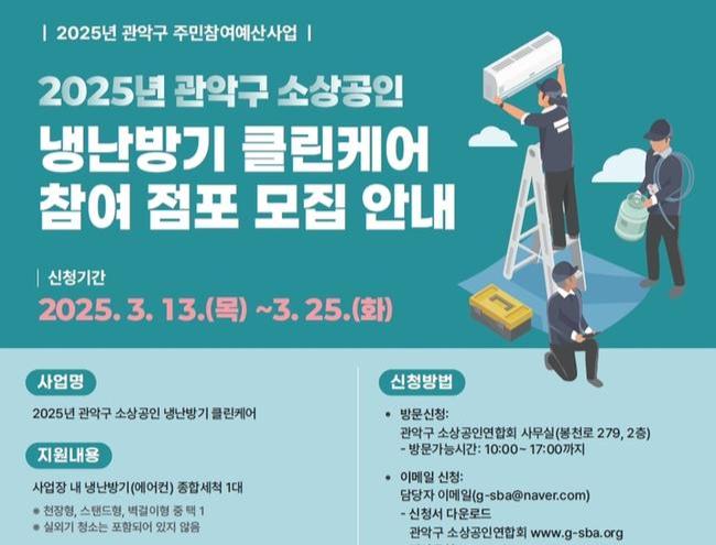 신청 기간은 3월 25일(화) 17시까지이다. 냉난방기 클린케어 지원을 원하는 관악구 소상공인은 관악구 소상공인연합회 사무실(관악구 봉천로 279, 2층)을 방문해 신청하거나, 담당자 이메일(g-sba@naver.com)로 신청서를 제출하면 된다.