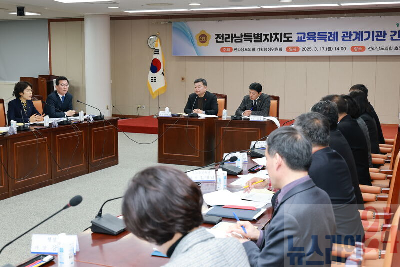 전라남도의회 정영균 의원(더불어민주당, 순천1)과 정철 의원(더불어민주당, 장성1)이 3월 17일 전라남도의회 초의실에서 「전남특별자치도 특별법」의 교육 여건 개선 및 교육자치권 강화를 위한 관계기관 간담회를 개최했다.