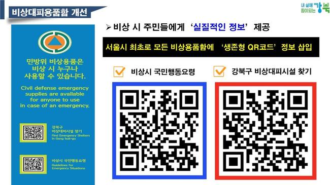 서울 강북구(구청장 이순희)는 재난 상황 발생 시 구민들의 안전을 위해 서울시 최초로 민방위 시설 비상용품함에 생존형 QR코드를 도입했다고 밝혔다.