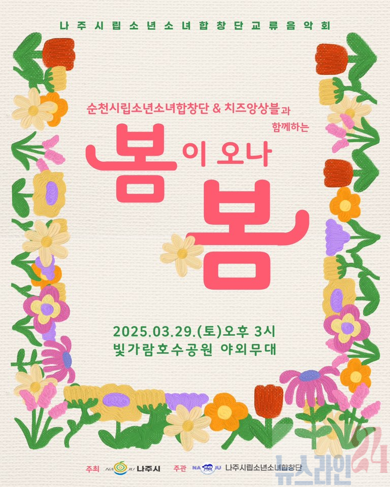 나주시립소년소녀합창단이 오는 29일 오후 3시 빛가람 호수공원 야외공연장에서 순천시립소년소녀합창단과 함께 초청 교류연주회를 연다. ‘봄이 오나 봄을 주제로 한 이번 공연은 봄의 설렘과 희망을 담아 두 도시 어린이들의 아름다운 화음으로 꾸며진다.