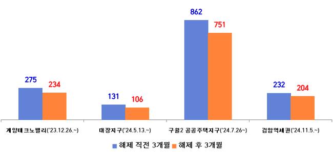 구체적으로 살펴보면, 2023년 12월 26일 해제된 계양테크노밸리(8.40㎢)의 거래 필지는 275필지에서 234필지로 줄었으며, 2024년 5월 13일 해제된 대장지구(0.72㎢)는 131필지에서 106필지로 감소했다. 또한, 2024년 11월 5일 해제된 검암역세권(6.15㎢)도 232필지에서 204필지로 거래량이 줄었다.