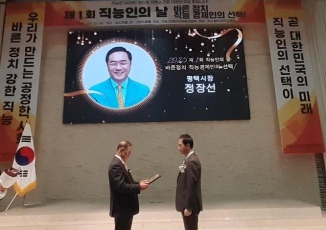 정장선 평택시장이 지난 21일 서울 공군호텔에서 열린 `제1회 직능인의 날` 기념식에서 기초자치단체부문 `바른정치, 직능경제인의 선택` 상을 받았다.