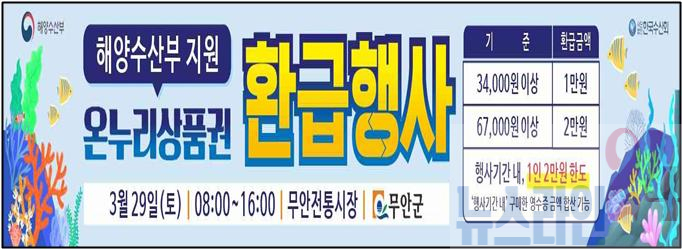 전남 무안군(군수 김산)은 오는 3월29일 무안 전통시장에서 수산인의 날(4월 1일)을 맞아 국내산 수산물 소비 촉진 활성화를 위해 온누리상품권 환급행사를 진행한다.