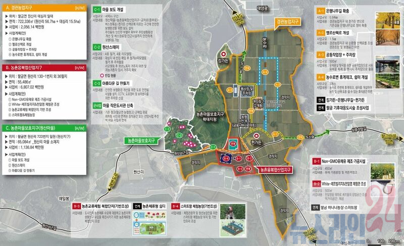 ‘경관농업지구’는 유채꽃밭을 활용해 산책로, 휴게시설 공간 등을 마련한다. ‘농촌융복합지구’는 유채와 바나나 등의 특화 작물들을 6차 산업과 연계할 수 있는 기반시설, 판매장, 농촌교류체험 복합단지를 조성한다. ‘농촌마을보호지구’는 원산마을을 지정하고 빈집, 유해시설 등의 정비와 이설로 농촌다움을 보존하고 청년들의 귀농‧귀촌의 중심지로 육성한다.