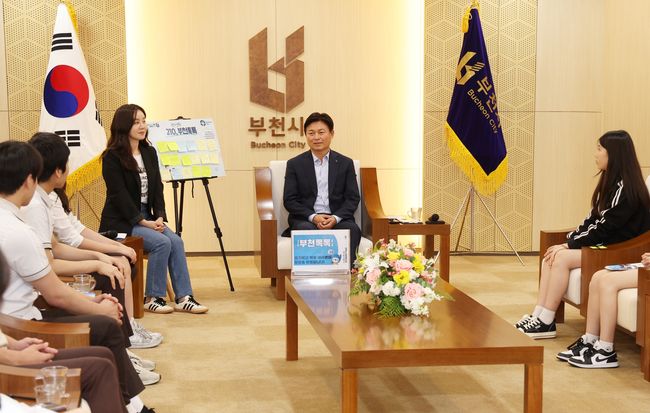 조용익 부천시장이 `210, 부천톡톡` 청사견학 프로그램으로 경기예고 학생들을 만나 이야기를 나누고 있다.
