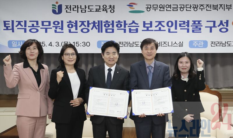 전라남도교육청은 4월 3일(목) 청사 5층 비즈니스실에서 공무원연금공단 광주전북지부와 퇴직공무원 현장체험학습 인력풀 구성을 위한 업무협약을 체결했다.