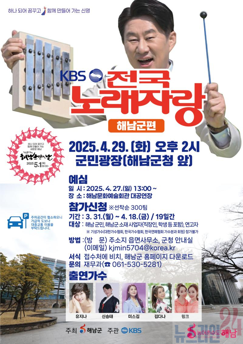 특히 이와 관련해 전국노래자랑의 주인공인 일반 출연자 예심 접수가 시작됐다. 예심참가는 기성 가수를 제외한 군민 누구나 신청 가능하며 오는 4월 18일까지 각 읍면사무소, 군청 안내실을 직접 방문 신청하거나 해남군 누리집 군정 알리미에서 신청서를 내려받아 이메일(kjmin5704@korea.kr)로 접수 가능하다.