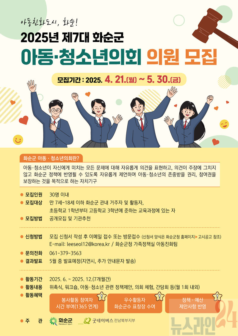 아동친화도시 화순군(군수 구복규)은 ‘2025년 제7대 화순군 아동·청소년의회’ 의원 30명을 오는 4월 21일부터 5월 30일까지 공개 모집한다고 8일 밝혔다.