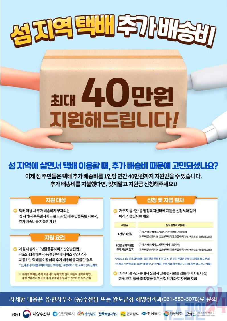 완도군은 섬 지역 택배 서비스 이용 시 발생하는 기본 배송료 외 추가 택배비를 지원하는 ‘섬 지역 생활 물류 운임 지원 사업’을 추진한다.
