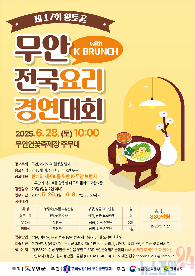 신청은 만 13세 이상 대한민국 국민이면 누구나 가능하며, 무안의 식재료를 활용해 다국적 샐러드를 포함한 브런치 1세트를 출품하면 된다.