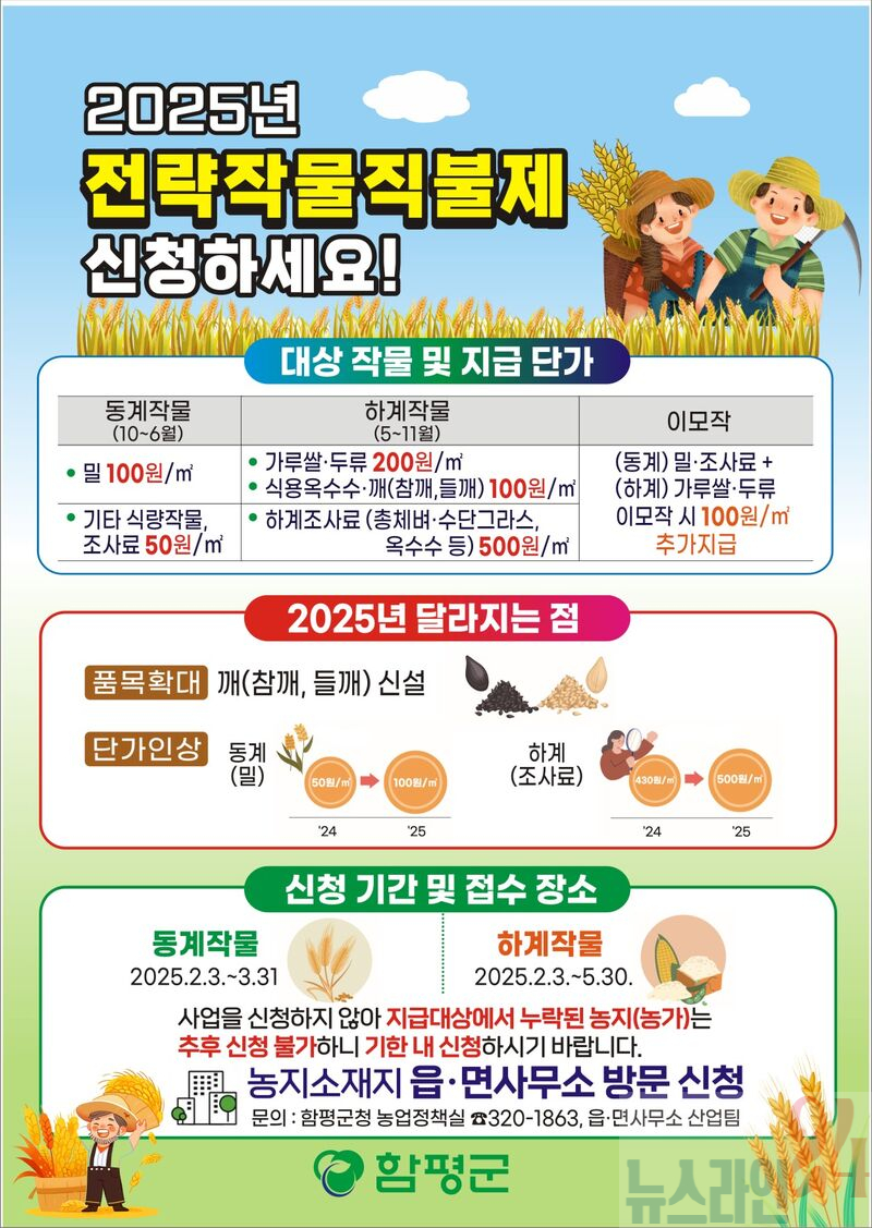 함평군은 11일 “전략 작물 직불제(하계작물), 논 타작물 재배 지원사업, 벼 재배면적 조정제도 등 각종 지원을 희망하는 농업인은 오는 5월 30일까지 농지 소재지 관할 읍·면사무소에서 신청할 수 있다”고 밝혔다.