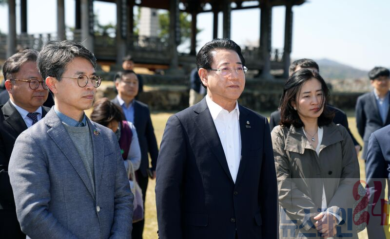화순 적벽 상수원보호구역 개발을 위한 상수원관리규칙 개정과 관련하여 김완섭 환경부 장관이 15일 화순 적벽 일원을 방문한 가운데 김영록 전라남도지사가 구복규 화순군수로부터 동복 상수원보호구역 개요에 대해 설명을 듣고 있다.