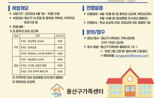 `찾아가는 성교육`은 용산구청에서 지원하는 양성평등기금지원사업의 일환으로, 양성평등(성인지감수성), 성폭력 예방, 경계 존중, 디지털 성범죄 예방 등 다양한 주제로 프로그램을 진행한다. 이 교육은 학생뿐만 아니라 부모를 대상으로도 이루어지며, 지역주민과 함께 하는 양성평등 인식 개선 캠페인도 진행해 올바른 성인지 문화를 조성하고자 한다.