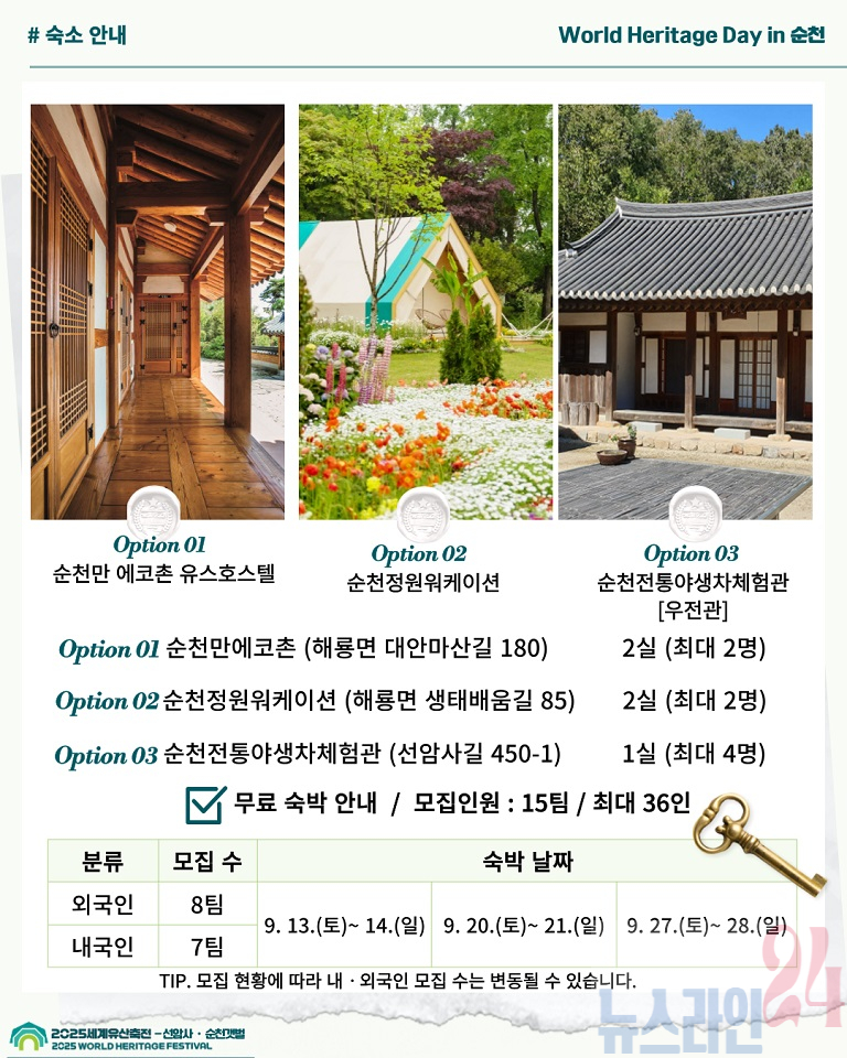 ‘월드 헤리티지 데이 in 순천’이라는 이름으로 진행되는 이번 행사는 세계유산축전의 성공적인 개최를 위한 사전 홍보 이벤트로, 개인 SNS에 간단한 미션을 수행한 내·외국인에게 순천에서의 1박 2일 숙박권을 제공한다.