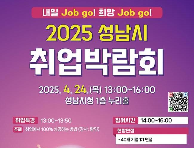 성남시(시장 신상진)는 오는 4월 24일 오후 1시부터 4시까지 성남시청 1층 누리홀에서 `2025 성남시 취업박람회`를 개최한다.
