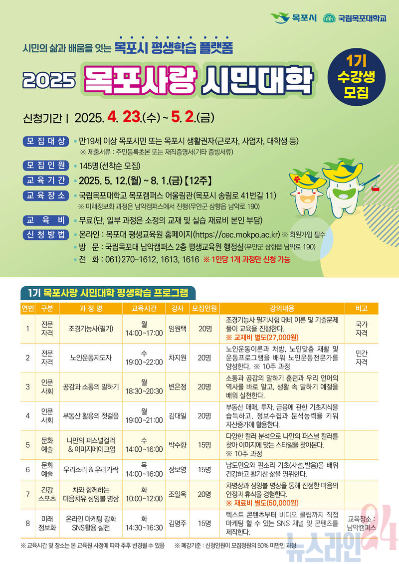 교육은 국립목포대학교 목포캠퍼스와 남악캠퍼스에서 이뤄지며, ▲조경기능사(필기), ▲노인운동지도자, ▲공감과 소통의 말하기 등 총 8개 강좌에 150여 명을 선착순 모집한다.