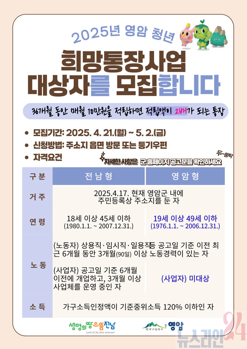 영암군(군수 우승희)이 4/21~5/2일 ‘2025년 영암군 청년 희망 디딤돌 통장사업’ 참여자를 모집한다.