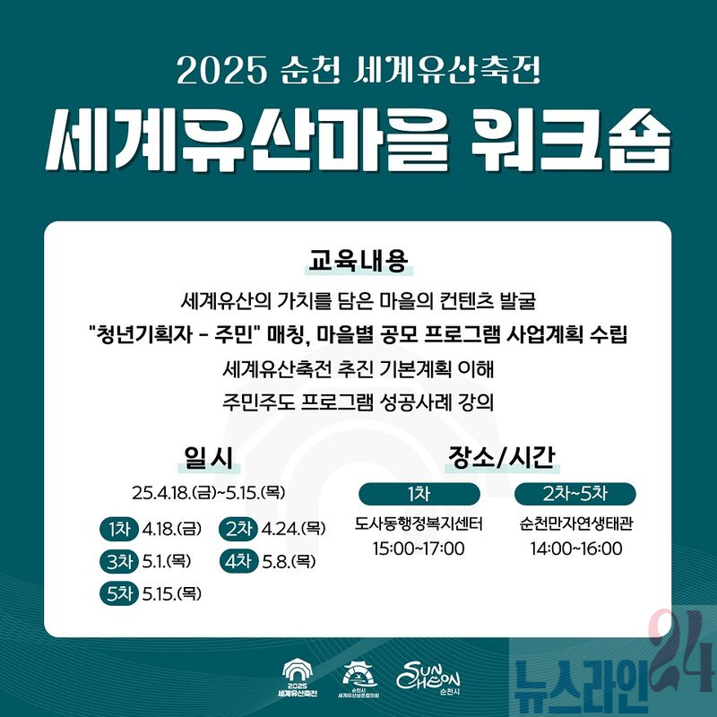 2025 세계유산축전-선암사・순천갯벌을 추진 중인 순천시 세계유산보존협의회는 5월 15일까지 ‘세계유산마을 워크숍’을 개최한다고 밝혔다.