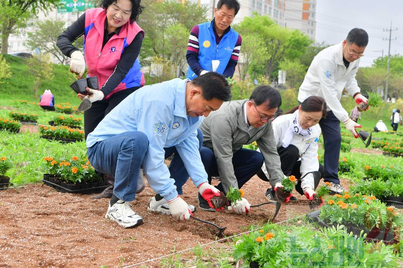 농촌지도자회, 생활개선회, 4-H(에이치)연합회, 귀농귀촌인협의회 4개 단체 회원 200여 명은 제2황룡교부터 문화대교까지 이어지는 17개 구간에 메리골드, 데이지 등 6만여 주를 식재했다.