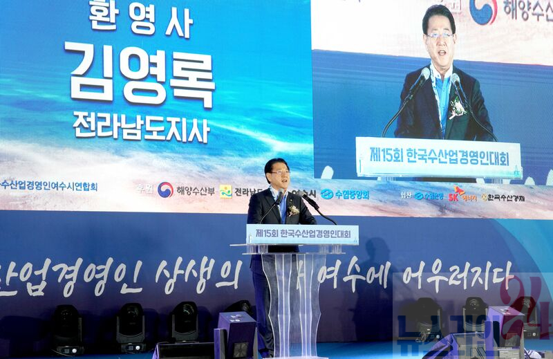 김영록 전라남도지사가 28일 여수세계박람회장에서 열린 ‘제15회 한국수산업경영인 전국대회’에서 환영사를 하고 있다.