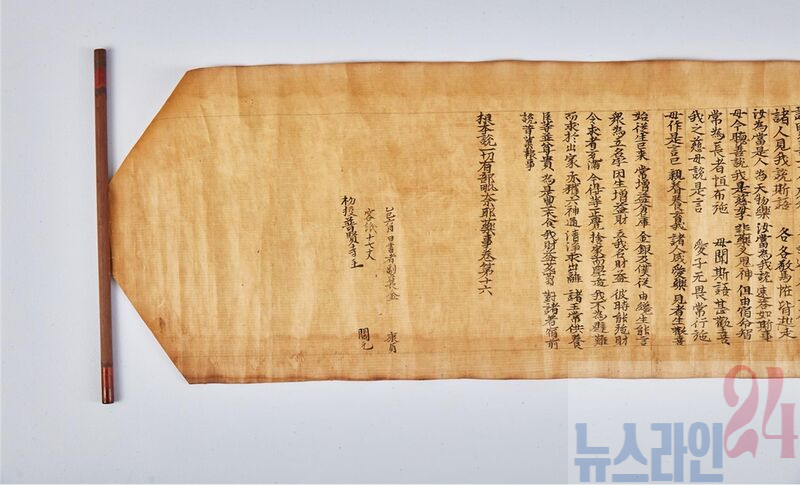 이번에 지정된 ‘근본설일체유부비나야약사 권 제16’은 고려 중기인 12~13세기, 당시 지방관이었던 김강정이 발원해 백지에 직접 필사한 불교 경전이다. 보현사 주지 활원이 이를 교정했다는 사실이 권말에 기록돼 있다. 이는 고려시대 사경(寫經)의 제작 방식과 당시 불교계 인물 관계를 구체적으로 이해할 수 있는 매우 귀중한 자료이다.