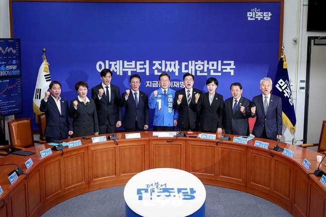 이재명 대통령선거 후보가 2025.04.28.(월) 국회 본청 당대표회의실에서 열린 최고위원회의에 참석하여 기념 촬영을 하고 있다.