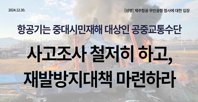 경제정의실천시민연합(이하 경실련)은 12월 30일, 제주항공 무안공항 참사에 대한 입장을 발표하며, 희생자와 유가족에게 깊은 애도를 표하고 부상자의 빠른 쾌유를 기원했다. 경실련은 이번 사고를 “중대시민재해 대상인 공중교통수단의 참사”로 규정하며, 국토교통부와 항공사고조사위의 철저한 원인 규명과 재발 방지 대책 마련을 촉구했다.