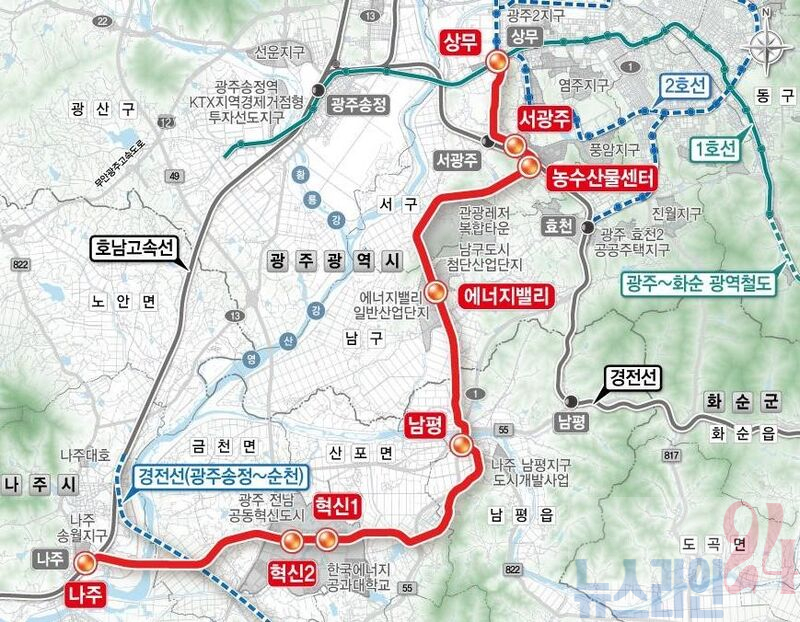 광주~나주 광역철도는 오는 2030년까지 총사업비 1조 5천192억 원을 투입해 광주광역시 상무역을 시점으로 대촌~남평~혁신도시~나주역을 연결(L=26.46㎞)하는 서남권 최초의 광역철도 국책사업이다.