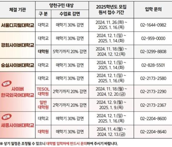 이들 대학과의 협력을 통해 양천구민은 누구나 매 학기 수업료 30% 감면 혜택을 받을 수 있다. 사이버대학교 신청 마감은 학교별 다소 상이하므로 자세한 사항은 대학 입학처에 문의하면 된다.