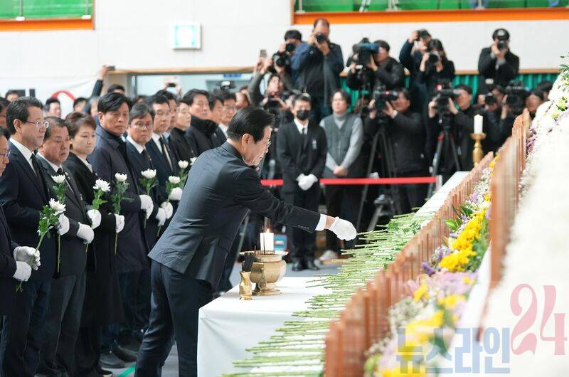 김영록 전라남도지사와 더불어민주당 이재명 대표가 30일 무안스포츠파크에 마련된 제주항공 여객기 추락사고 희생자 합동분향소를 방문해 추모하고 있다.
