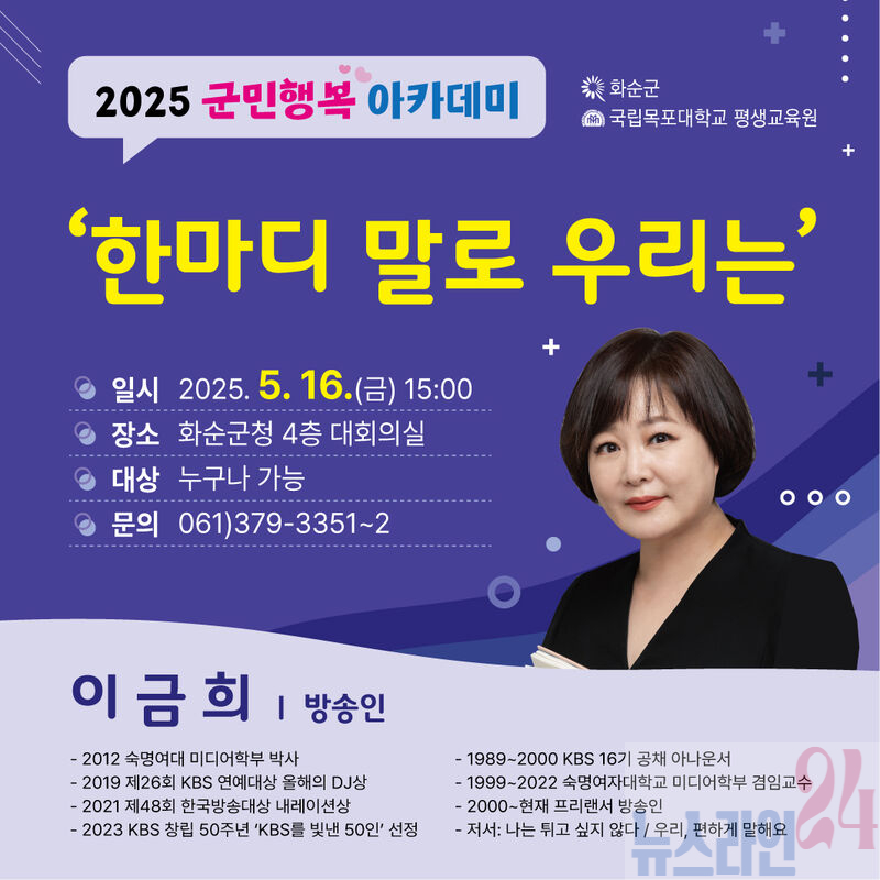 화순군(군수 구복규)은 오는 5월 16일(금) 오후 3시 화순군청 4층 대회의실에서 '2025 군민행복 아카데미 3회차 강연을 개최한다고 밝혔다.