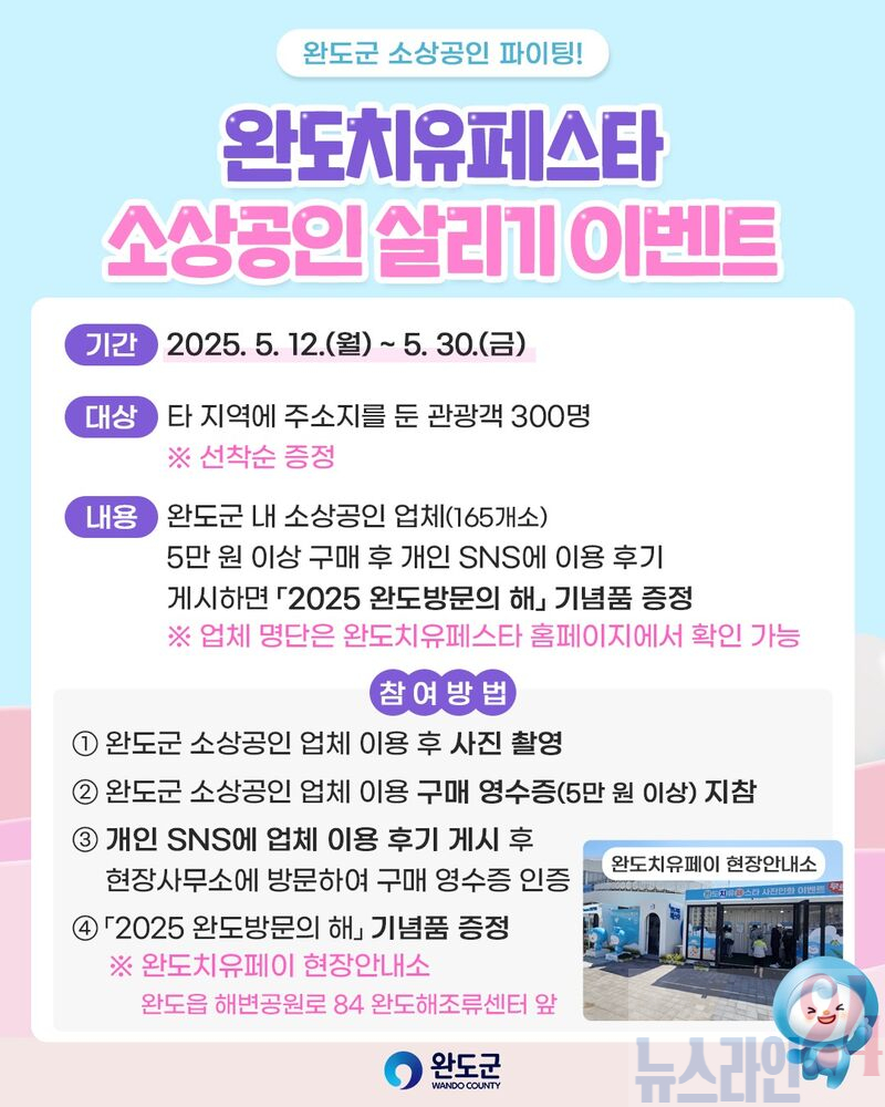완도군은 5월 12일부터 5월 30일까지 소상공인을 응원하고 완도를 찾는 관광객들에게 기념품을 제공하고자 ‘소상공인과 함께 하는 완도 치유 페스타’를 진행한다.