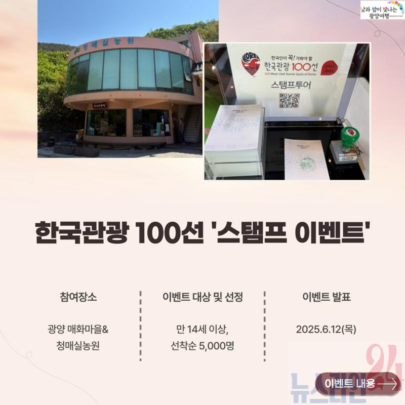 광양시는 한국관광공사와 함께 여행하기 좋은 5월 한 달 동안 ‘2025~2026 한국관광 100선’ 스탬프 투어 이벤트를 진행한다고 14일 밝혔다.