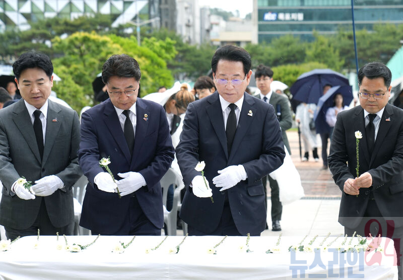 김영록 전라남도지사가 16일 오전 전남도청 앞 광장에서 ‘아! 오월, 다시 만난 오월’을 주제로 열린 ‘전남 5·18민주화운동 45주년 기념식’에서 헌화하고 있다.