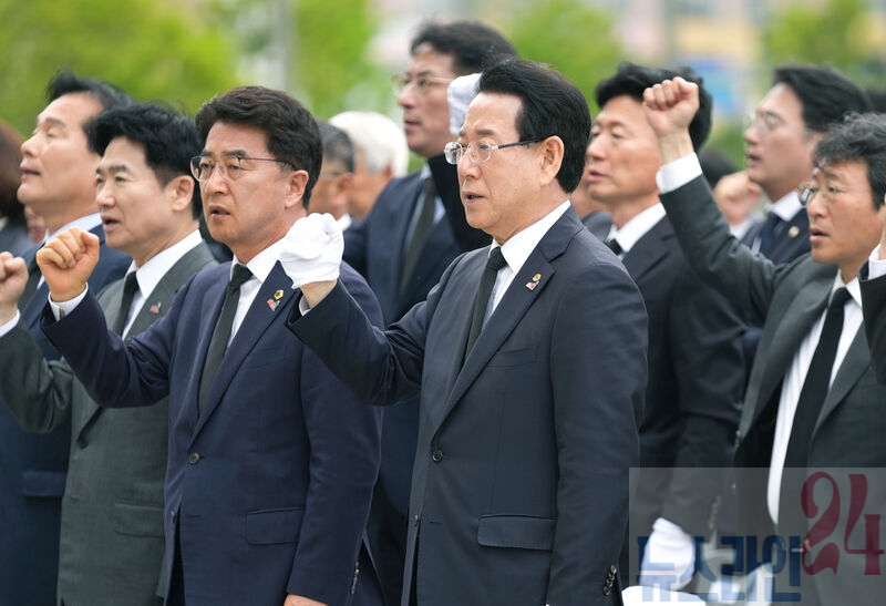 김영록 전라남도지사가 16일 오전 전남도청 앞 광장에서 ‘아! 오월, 다시 만난 오월’을 주제로 열린 ‘전남 5·18민주화운동 45주년 기념식’에서 임을 위한 행진곡을 제창하고 있다.