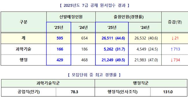 2025년도 국가공무원 7급 공개경쟁채용시험의 평균 경쟁률이 44.6대 1로 나타났다. 이는 최근 5년간 경쟁률 중 가장 높은 수치로, 전년도보다 경쟁이 다소 치열해진 양상이다.