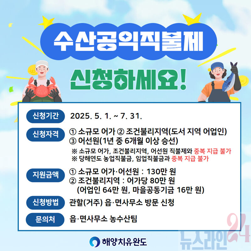 완도군의 경우 10개 읍면, 48개 도서 지역이 해당된다. 신정 자격은 직전 년도(2024년) 기간 중 60일 이상 조업하거나 수산물 판매액이 연간 120만 원 이상인 어업인이며, 어가당 80만 원을 지원한다.