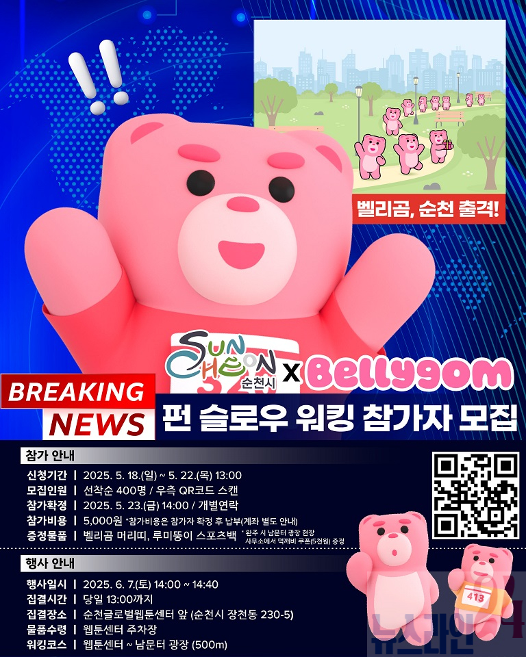순천시(시장 노관규)는 오는 6월에 열리는 ‘원츠(Wants) 순천’ 축제 일환으로 글로벌 인기 캐릭터 벨리곰과 함께 걷는 ‘FUN SLOW WALKING(이하 펀 워킹)’참가자를 모집한다.