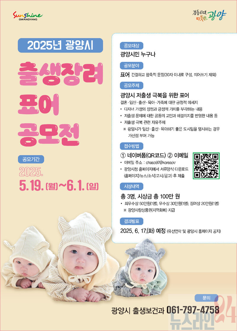 광양시는 저출산 문제에 대한 시민들의 관심과 참여를 유도하고, 결혼·출산·육아에 대한 긍정적 인식을 확산하기 위해 ‘2025 광양시 출생장려 표어 공모전’을 개최한다고 19일 밝혔다.