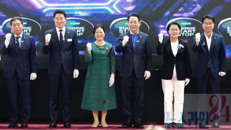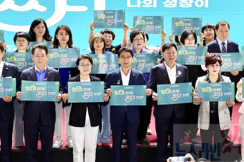 김영록 전라남도지사가 21일 순천 팔마실내체육관에서 열린 ‘2025년 전남 여성 일자리 박람회’에서 참석자들과 퍼포먼스를 하고 있다.